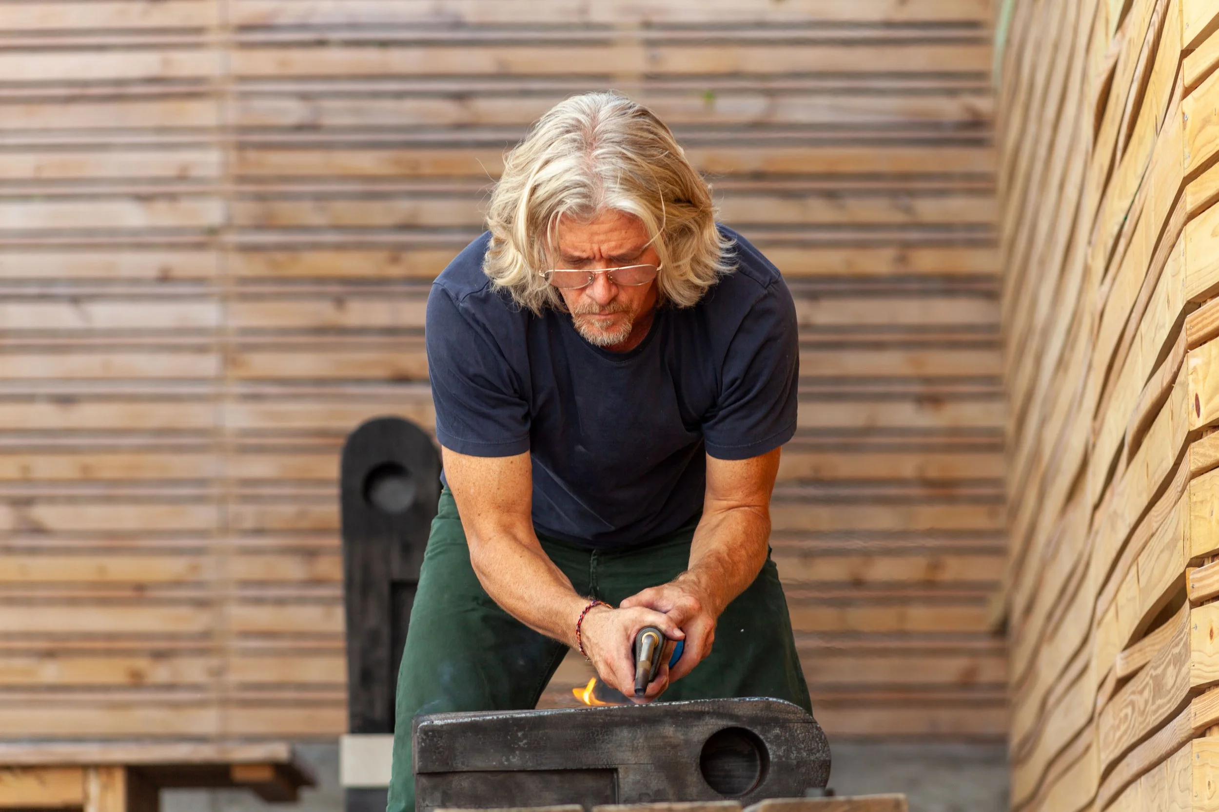 When Scott VanderVoort took over the sculpture garden for the 2025 season at Thomas VanDyke Gallery, he came to the space with a curiosity, to explore structure, weight, light, weather, and all the unknown variables, with an open mind. He came to ask questions and learn, to try new processes, to think while doing, to problem solve and contemplate. VanderVoort engages with his work. He knows the texture and mass of each piece, the cracks where they’ve been joined, the black, then red, then white hot wood under the flaming torch, then the hiss and smoke under the water from the hose. There’s a sense of calm thrill and quiet wonder when watching VanderVoort work, a fulfillment in his order and experimentation. His work is dynamic but soothing; big ideas with measured approach that results in an evolution of the curious mind and the physical world.