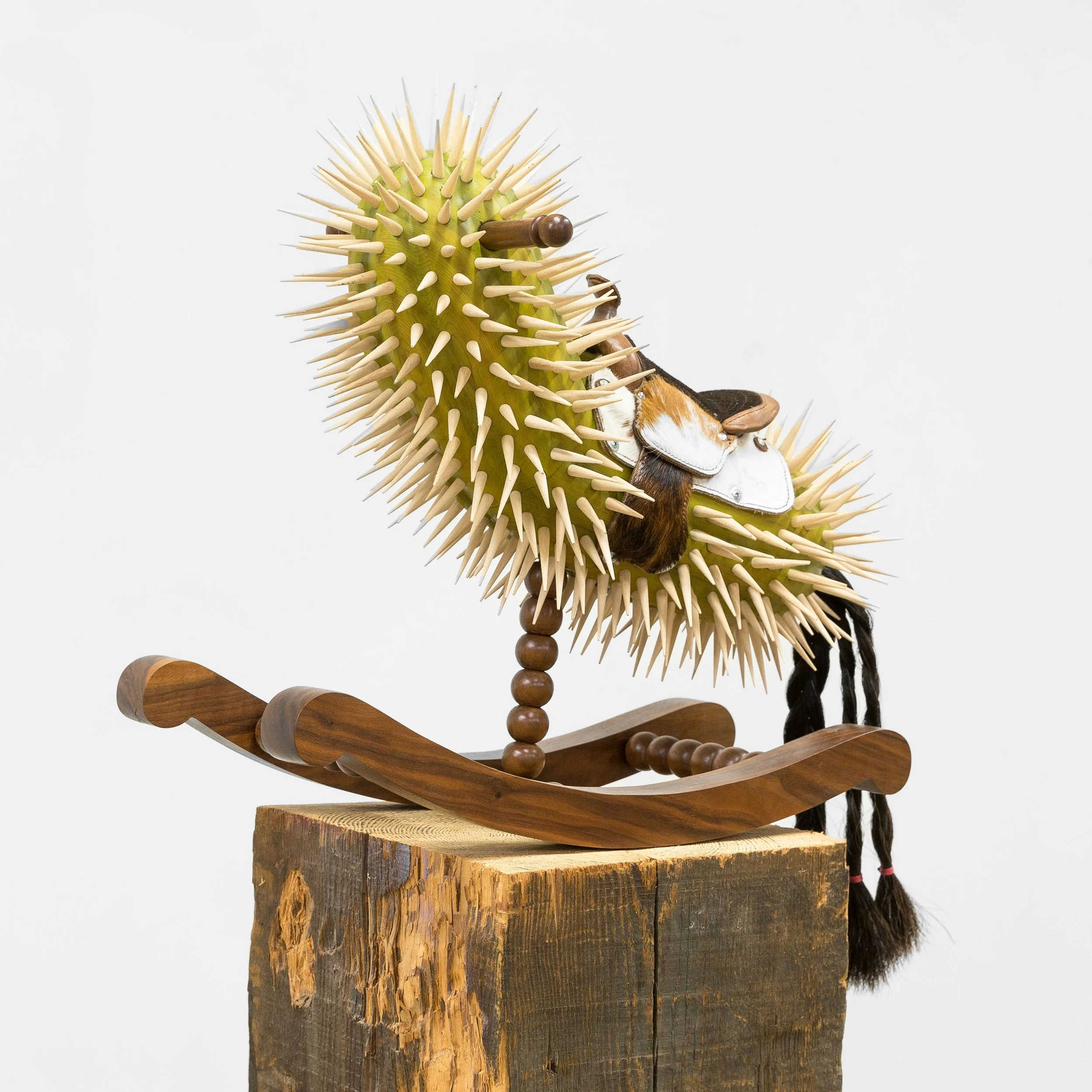 The artists in this exhibition all use protrusion or pointy-ness to create meaning without protraction. These works are forcefully direct and unapologetically take aesthetics to a material zenith we all can recognize as a point. Honed like a knife’s tip, these artists are poking and probing the sleek automotive exterior of abject, stunted and empty political gestures that are the hallmark of our age.