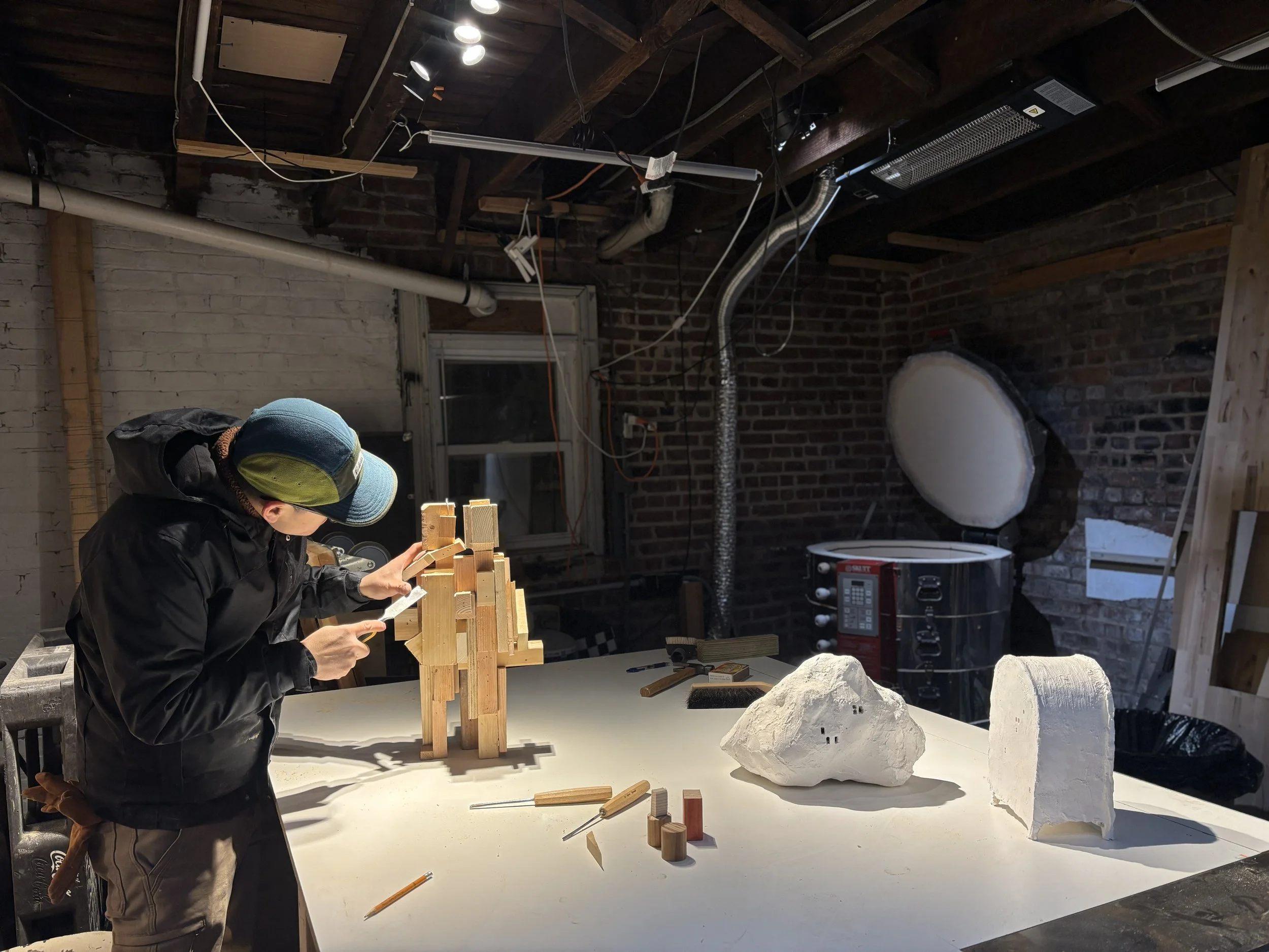 JK: Besides being a sculptor, I also teach at the Art Students League at night. And because of my teaching schedule I get to spend most of my daytime in my studios. Luckily enough I have two work spaces, one is where I do most of my clay work which is in the basement of the house, the other one is sort of a wood-shop in a detached garage space across the backyard. I spend more time in the garage space on the warmer days, and on the winter days I mostly work in the heated basement. The two spaces have two polarized atmospheres. The clay space is a bright environment lit with white lights, which I use when I’m working on colors, details, and accuracy. The wood-shop is lit with warmer spot lights and has more of a barn-like atmosphere with exposed wood joists and brick walls. I have a big white work bench in the wood-shop, I like to call it the “conspiracy board”, like the center piece you’d see when they finally busted the psychopath’s den in a detective movie. I simply use it to conspire ideas and ponder between pieces. I think having two extremely different spaces to do my work helps me a lot for my senses to stay sharp.