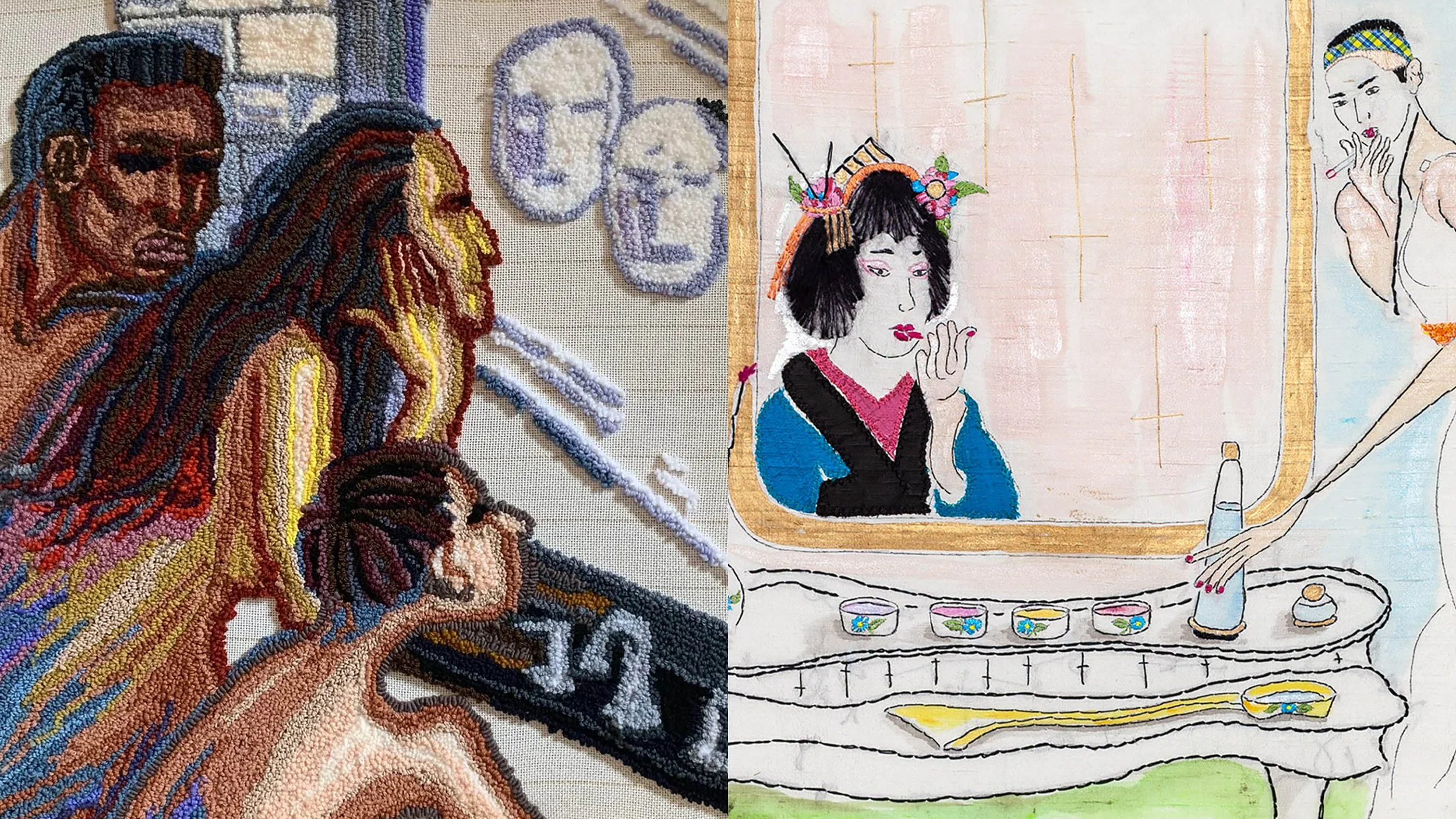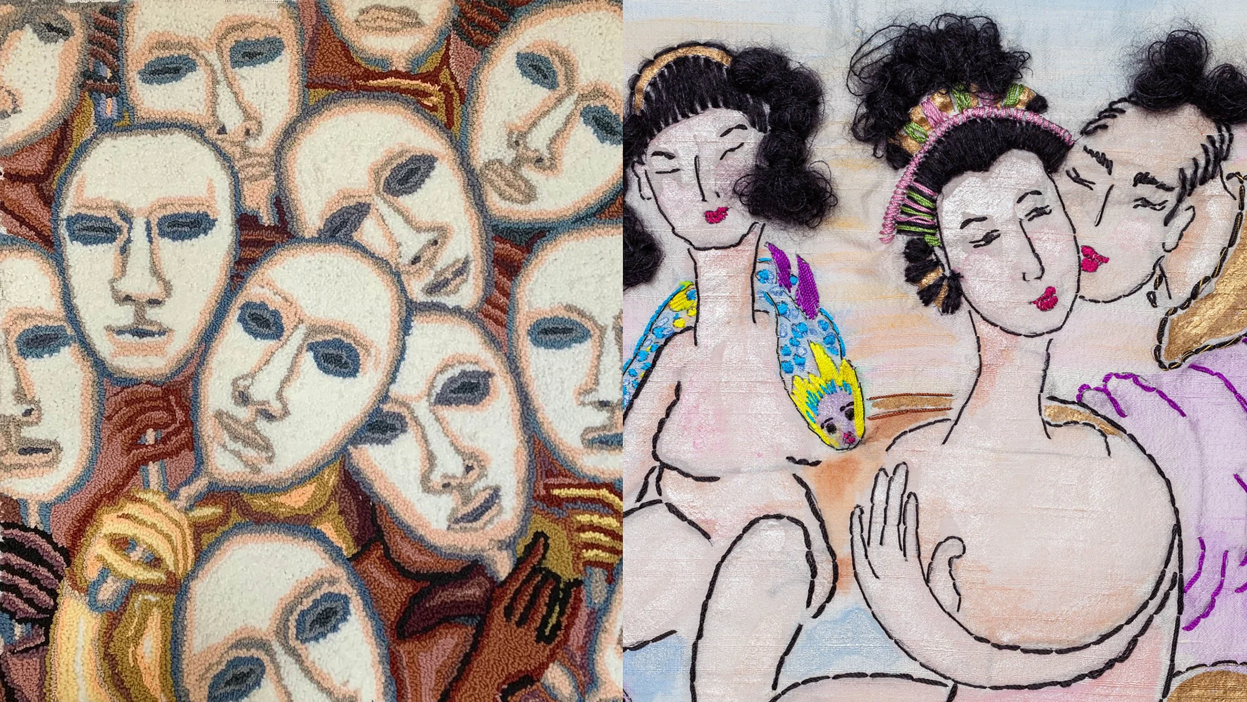 Scavotto's process involves creating line drawings of characters, which she then enhances with color and embroidery. Each figure takes on a distinct personality as she interacts with them through the artistic process, resulting in a rich dialogue within the artwork.